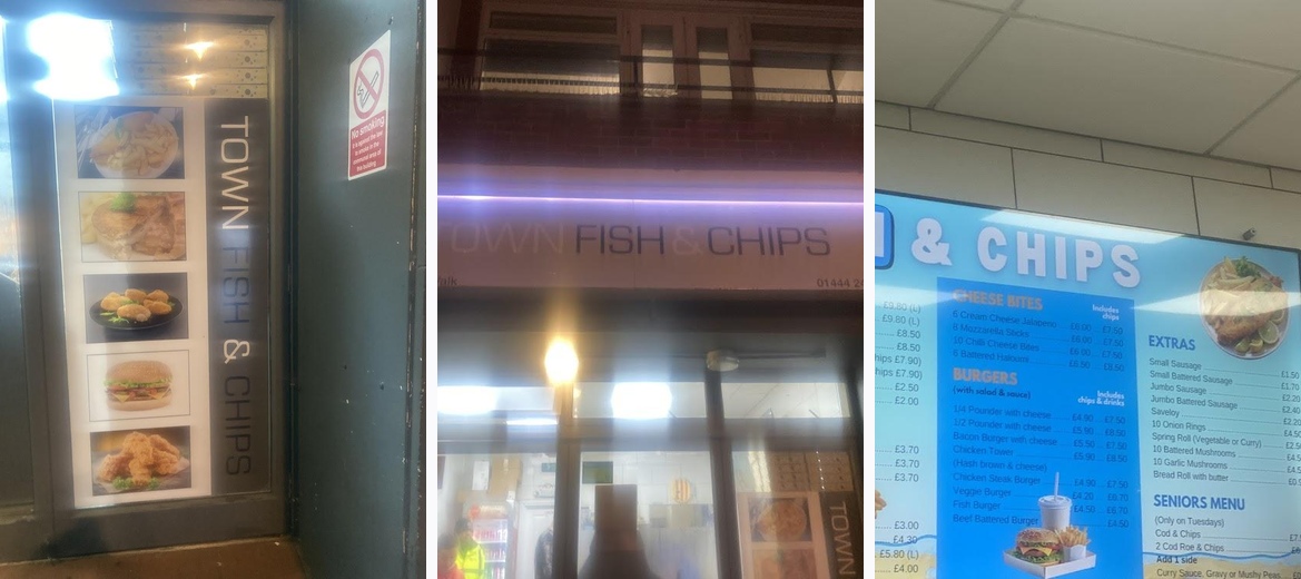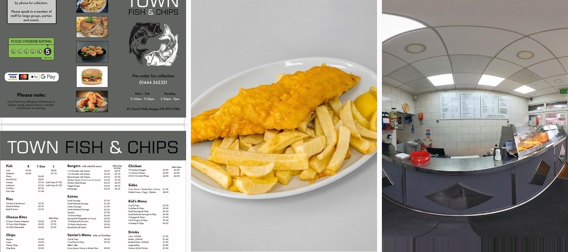 Welcome to Town Fish & Chips, your go-to destination for the finest fish and chips in Burgess Hill! Located at 45 Church Walk, we pride ourselves on serving up delicious, hot meals that offer exceptional value, with prices ranging from just £1 to £10. Whether you're craving a quick bite for lunch or a satisfying dinner, our casual atmosphere is perfect for solo diners and families alike. Enjoy our excellent service options, including takeaway and kerbside pickup, along with a kid-friendly menu. With accessible facilities and a staff dedicated to providing a memorable dining experience, Town Fish & Chips is where tradition meets taste.Diners rave about the homemade curry sauce, a delightful addition that elevates the fish and chips experience. The cod is consistently praised for its freshness and perfectly crispy batter, epitomizing what fish and chips should be. Many customers enjoy the variety available, including pies and juicy burgers, which broaden the appeal for diverse palates. The staff often receives high marks for their friendly service, creating a welcoming environment that keeps patrons returning. Additionally, the generous portions and affordable pricing make it a hit among families and solo diners alike.
